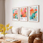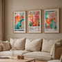 A rich color palette of green, turquoise, blue, yellow, orange, and soft pink adds warmth and depth, while painterly details give the artwork a refined, contemporary feel. The prints are artist-inspired, fully original decorative designs.