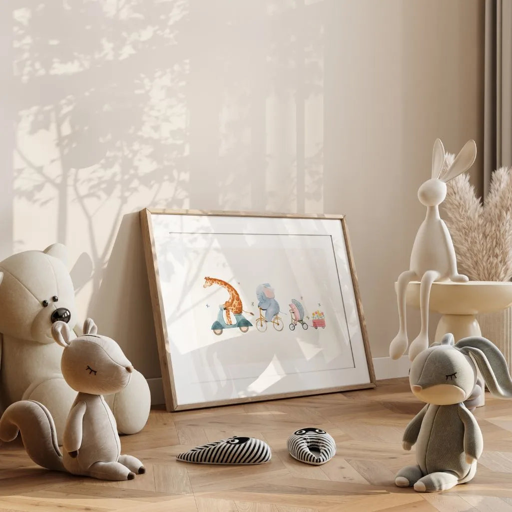 Animals on a Ride Poster is delicate kids wall art in a light watercolour style, featuring a charming scene: a giraffe on a scooter, an elephant on a bicycle, and a hedgehog on a tricycle pulling a little cart filled with colourful flowers. The airy, bright composition with plenty of “breathing space” looks beautiful above a cot, in a play corner, or in a preschool setting. Soft pastel tones and a storybook mood help create a cosy, calm interior that feels warm and welcoming.