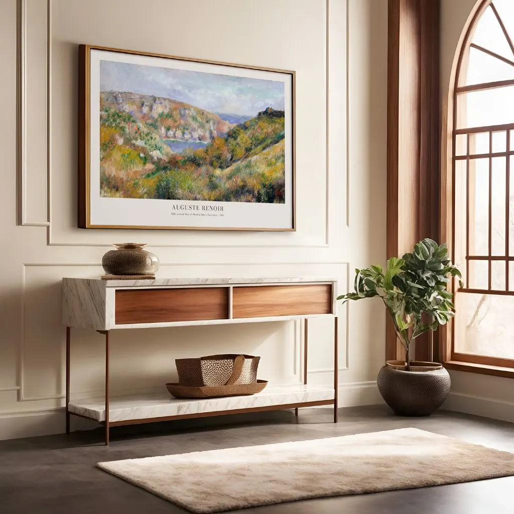 Bring sunlit coastal serenity to your space with this Auguste Renoir Hills Around Bay of Moulin Huet, Guernsey poster. Gentle hills glow in warm light, with soft hints of sea in the distance—classic impressionist wall art that feels airy, peaceful, and quietly uplifting.