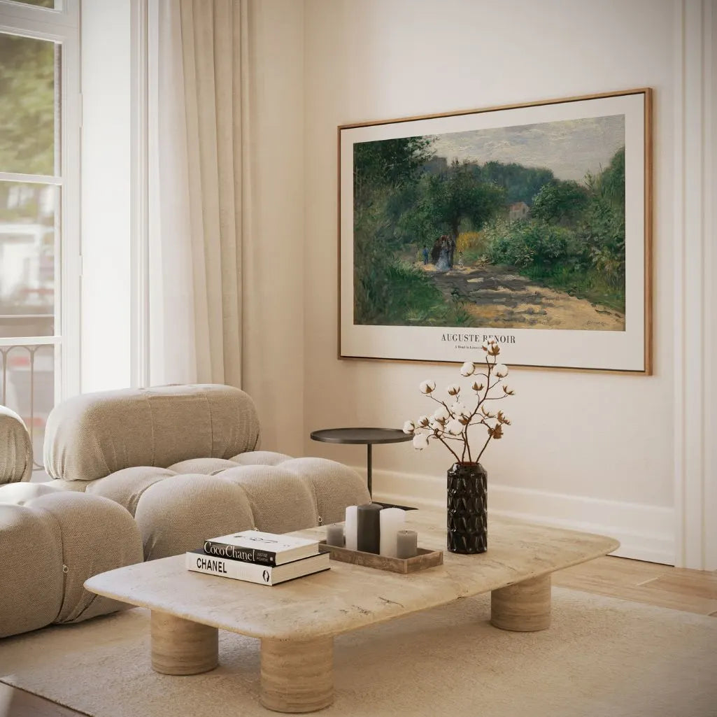 Bring quiet countryside elegance to your home with this horizontal-format Auguste Renoir A Road in Louveciennes poster. Painted early in his career, it captures walkers under trees in soft, dappled light—classic impressionist wall art that feels gentle, natural, and effortlessly timeless.
