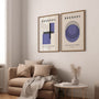 This set of two Bauhaus-inspired wall art prints presents a modern interpretation of classic geometric abstraction. The compositions are built around circles, rhythmic dots, rectangles, and precise vertical and horizontal lines, creating a strong architectural feel rooted in Bauhaus design principles.