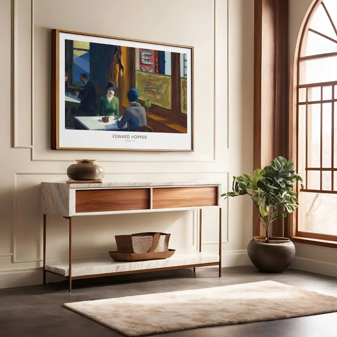 This Edward Hopper poster features Chop Suey (1929) in a horizontal format, capturing the mood of 1920s America through a quiet restaurant scene. Light and silence shape a subtle narrative of everyday life, where togetherness and distance exist side by side. Hopper’s precise composition and emotional restraint make this wall art a timeless study of individuality within the city.