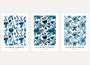 This set of three Flower Garden botanical prints features hand-painted watercolor florals inspired by classic botanical illustrations and decorative floral patterns. Each artwork showcases expressive blue flowers and delicate foliage arranged in a repeating, balanced composition.