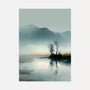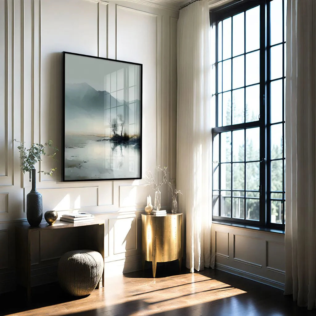 Misty Mountains is a serene wall art print featuring a peaceful lake framed by fog-covered mountains. Cool, muted tones and soft light create a painterly sense of stillness, bringing depth and balance to the room without overwhelming the space.