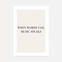 When Words Fail Music Speaks Poster is minimalist typographic wall art featuring the quote in elegant black on a light, warm background. Clean composition and classic lettering create a timeless look that adds mood without visual noise—perfect for spaces where you want calm design with meaning. The refined palette makes it easy to style in modern, Scandinavian, and japandi interiors, and it pairs beautifully with neutral prints in a curated wall gallery.