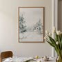 A calming piece of wall art featuring a delicate watercolour winter forest scene, where a snow-covered path winds between frosted fir trees. Cool tones of white, soft grey, and muted green create a quiet landscape filled with stillness and subtle winter magic. Perfect for scandi, hygge, japandi, and minimalist interiors, this artwork brings a natural, soothing presence and refined simplicity to your space. Display it as a framed poster for a polished, gallery-ready finish, or choose an unframed print for a clean, contemporary look.