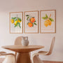 Soft watercolor textures, natural greens, and sunny citrus tones create a calm yet vibrant atmosphere, perfect for brightening modern interiors. Designed as a cohesive set of three, these prints are ideal for kitchens, dining rooms, living spaces, vacation homes, cafés, or coastal-inspired interiors.