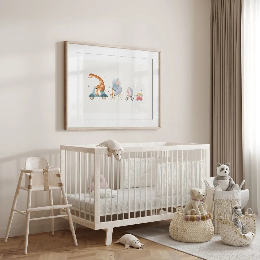 Animals on a Ride Poster is delicate kids wall art in a light watercolour style, featuring a charming scene: a giraffe on a scooter, an elephant on a bicycle, and a hedgehog on a tricycle pulling a little cart filled with colourful flowers. The airy, bright composition with plenty of “breathing space” looks beautiful above a cot, in a play corner, or in a preschool setting. Soft pastel tones and a storybook mood help create a cosy, calm interior that feels warm and welcoming.