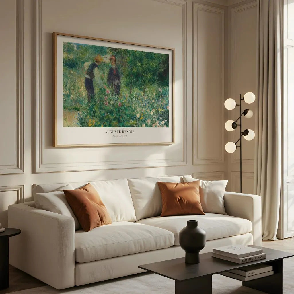 Bring warm French charm to your home with this horizontal-format Auguste Renoir Picking Flowers poster. Two women lean into a lush garden in a scene filled with sunlight, gentle movement, and that signature Renoir softness—classic impressionist wall art that feels intimate, fresh, and effortlessly elegant.