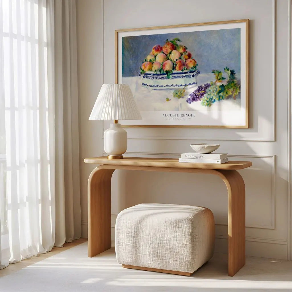 Add a soft, refined accent to your home with this horizontal-format Auguste Renoir Still Life with Peaches and Grapes poster. A bowl of ripe fruit is painted with gentle impressionist brushwork and a pastel backdrop, creating elegant wall art that feels warm, sensual, and quietly luxurious.