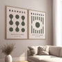 This Set of 2 Bauhaus green posters blends modernist geometry with a muted, elegant palette. Rhythmic circles, simple forms, and balanced symmetry create wall art with a timeless, design-led character. Shades of green—from deep olive to softened, earthy tones—bring a calm, grounded atmosphere that works beautifully in contemporary spaces.