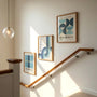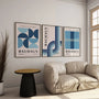 This Set of 3 Bauhaus posters, “Weimar Rhythm,” reimagines classic modernism with crisp geometry and a measured sense of movement. Rhythmic lines and balanced shapes are paired with a calm palette of blues and deep navy, creating a cohesive trio that feels both architectural and elegant.