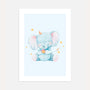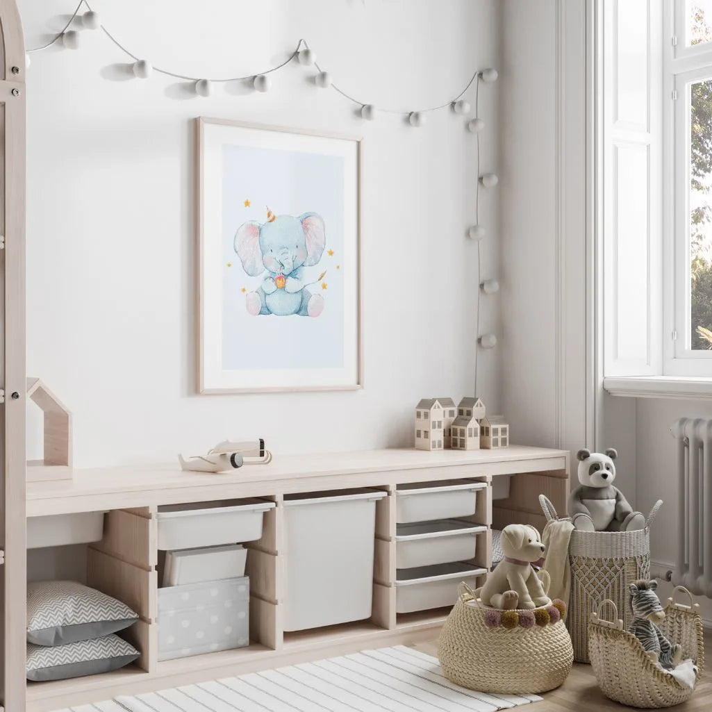 This charming wall art features a watercolor baby elephant wearing a birthday hat, holding a tiny cake and surrounded by small stars. Soft pastel blue tones and gentle textures create a calm, joyful look—perfect for a nursery, child’s room, or a cosy play corner.