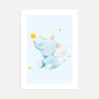 This delicate wall art features a watercolor baby elephant holding a star wand, set in a soothing pastel blue palette with tiny scattered stars. The minimalist illustration creates a calm, storybook atmosphere that feels gentle and timeless in a nursery or child’s room.