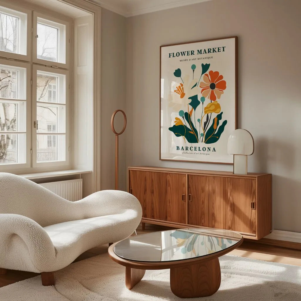This retro-style botanical wall art features a colourful geometric-floral composition inspired by Barcelona’s Mediterranean energy. Warm oranges, soft off-white, and sunny yellow tones combine with deep green accents to create a decorative illustration that feels fresh, graphic, and confidently vintage.