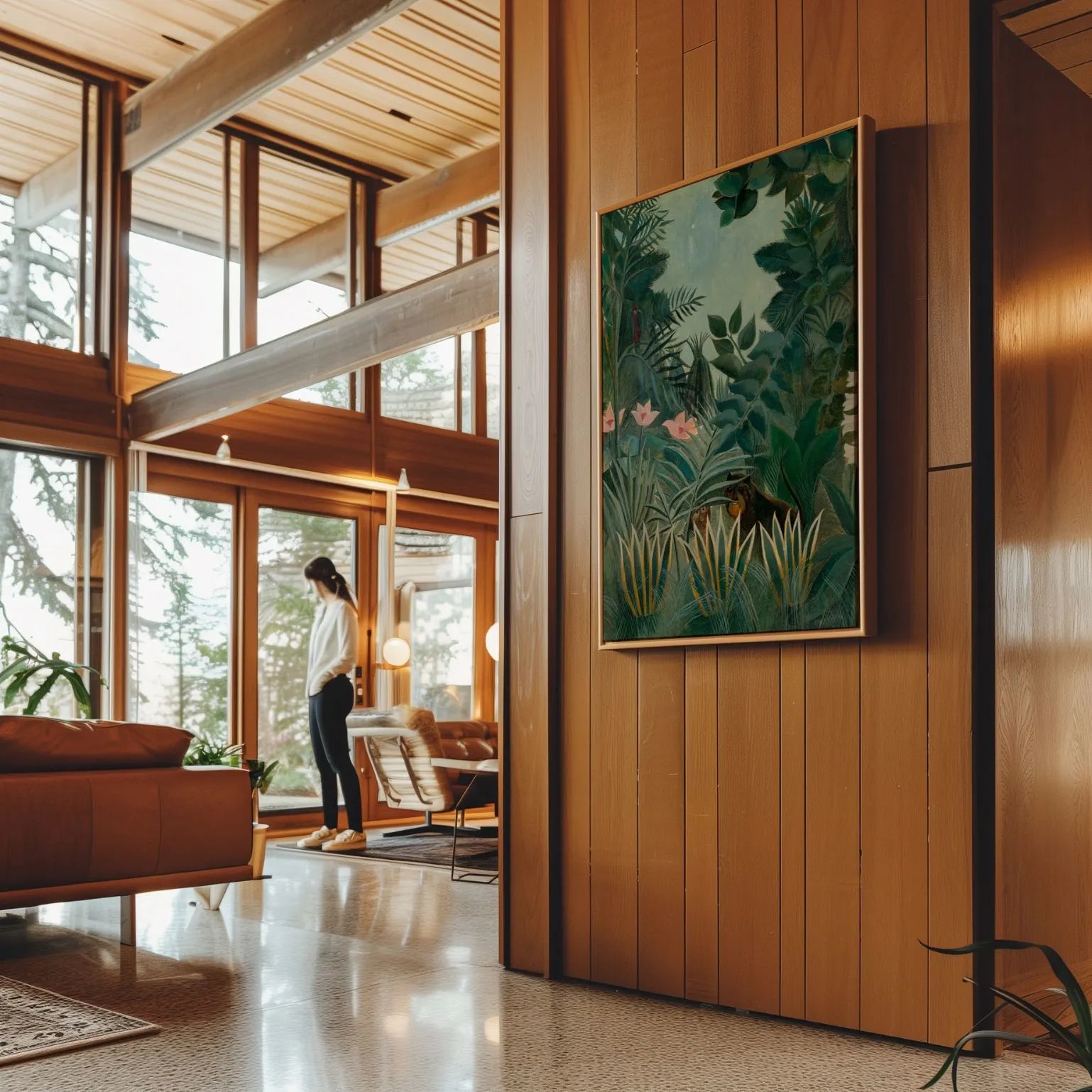 Rousseau created his iconic jungle works without traveling to exotic lands, drawing inspiration from botanical gardens and illustrated books. This framed canvas print reflects his distinctive style—naïve yet refined, expressive yet harmonious—making it a timeless addition to art-focused interiors.