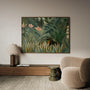 Step into a lush, dreamlike world with this framed canvas print of Henri Rousseau’s “Equatorial Jungle” in a horizontal format. Dense tropical leaves, towering palms, and exotic flowers create an immersive scene where hidden animals and watchful eyes seem to appear from the greenery. Rousseau’s precise, naïve style gives the painting its signature atmosphere—calm and enchanting, yet subtly mysterious.