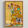 This framed canvas print features Gustav Klimt’s Fulfillment (1905), an iconic work from the monumental Tree of Life cycle and a signature example of Viennese Art Nouveau. A tender embracing couple sits at the centre, symbolising love, unity, and emotional completion, surrounded by richly patterned ornament and luminous golden tones.