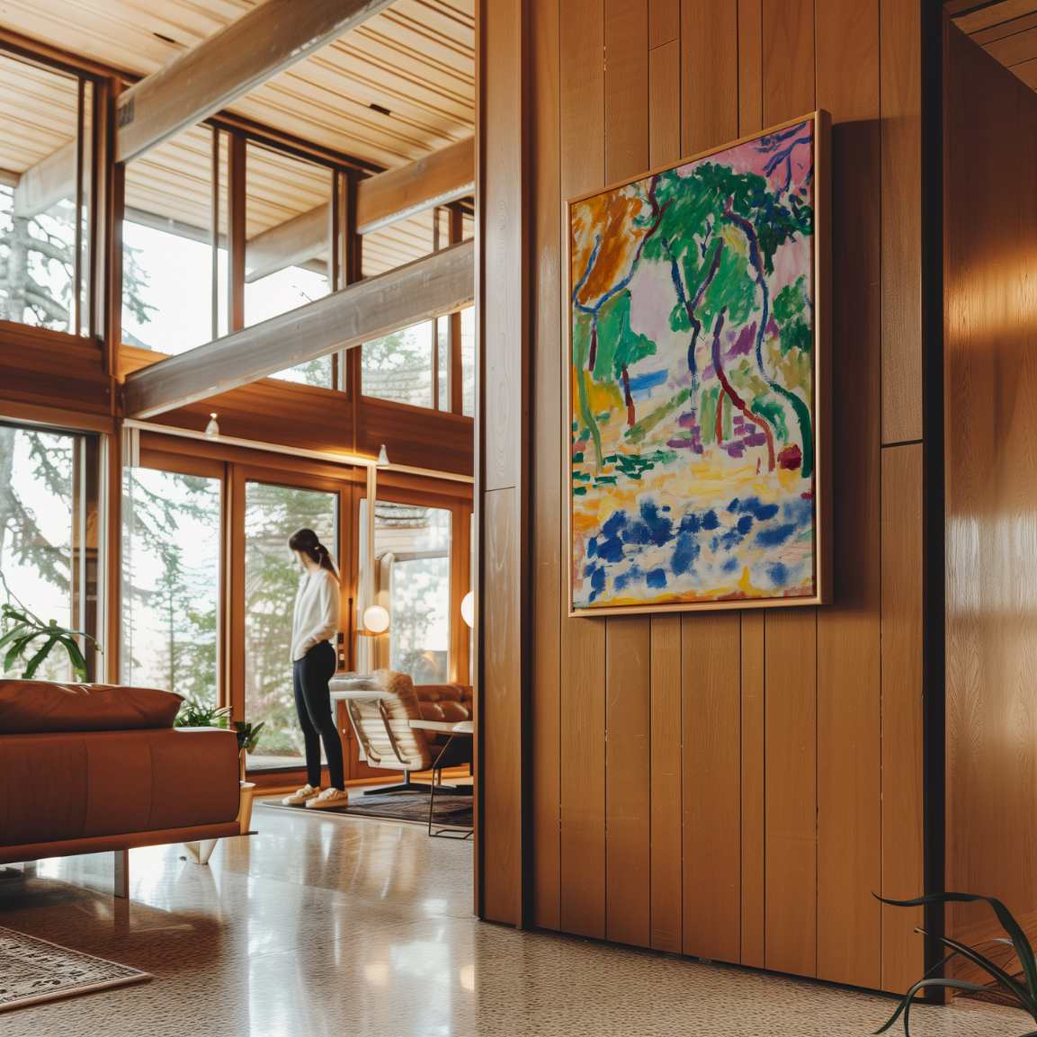 This framed canvas print features Henri Matisse’s Landscape near Collioure (1905), one of the defining works of his Fauvist period—when colour and gesture became the heart of modern painting. Created in the coastal town of Collioure, the scene radiates southern light and an expressive, almost abstract energy.