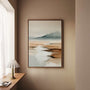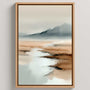 Create a quiet, airy atmosphere with this framed canvas print featuring a minimalist watercolor landscape. Soft beiges, misty greys, and warm browns shape a gentle mountain line and a calm water surface that fades into natural-looking haze. The smooth transitions of color bring openness and balance, while the watercolor style adds organic elegance without extra detail.