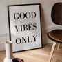 Keep your space feeling fresh with this minimalist quote wall art featuring “Good Vibes Only” in bold, elegant typography. The black-and-white design is clean, modern, and easy to style, making it a natural fit for Scandinavian, contemporary, and loft interiors. Display it as a framed poster for a polished look or choose an unframed print for a lighter, gallery-style feel. Perfect for living rooms, bedrooms, offices, or a focused work corner, this poster also makes a thoughtful, versatile gift for anyone who loves refined design and uplifting details.