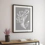 This minimalist floral wall art features a white hand-sketched flower illustration set against a soft grey background. The clean line work and restrained palette create a harmonious, modern composition with a subtle geometric rhythm—refined, calm, and easy to style.