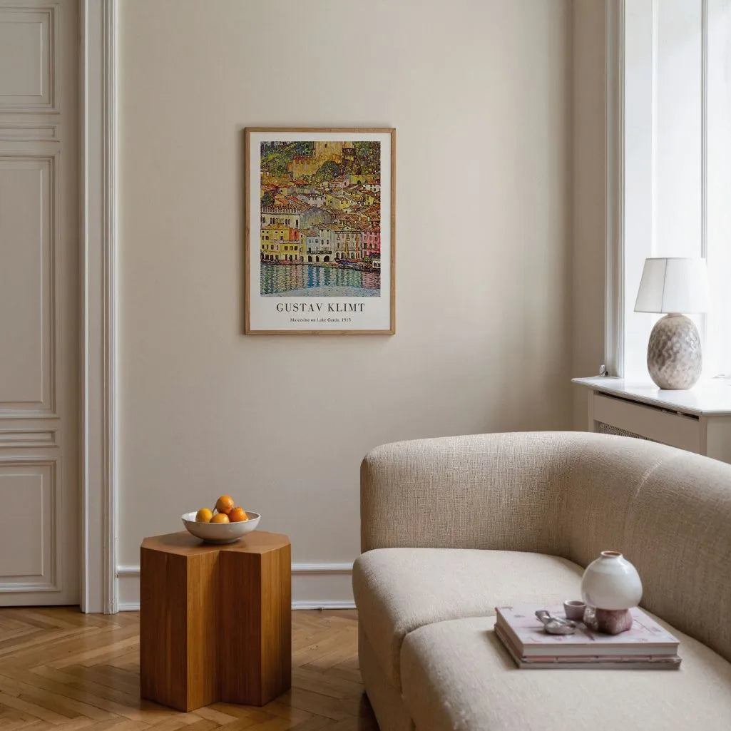 Malcesine on Lake Garda shows Gustav Klimt at his most atmospheric—stepping away from gilded portraiture to focus on architecture, color, and the sparkle of light on water. Geometric rooftop rhythms, saturated hues, and the shimmering lake surface create a serene scene with Art Nouveau elegance and impressionist freshness. This wall art brings Southern European warmth to modern classic, boho, art déco, or minimalist interiors, offering a relaxing focal point that still feels richly artistic. Available as a framed poster or an unframed print, it’s an effortless way to add sunlit calm to your living room, bedroom, or office.