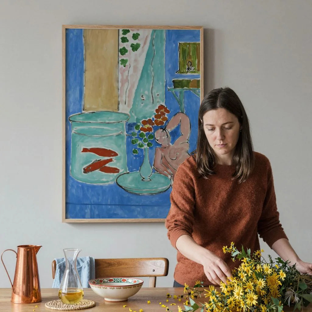 This Henri Matisse poster features Goldfish and Sculpture (1912) in a full-cover format, showing the complete composition with its bold colour fields and decorative rhythm. A still life with an aquarium of goldfish and a sculptural figure is rendered in intense blues and expressive forms, highlighting Matisse’s fearless approach to light, colour, and modern design.