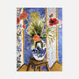 This vibrant wall art print features a richly decorative still life by Henri Matisse in a full-cover composition. A bouquet of intensely coloured flowers sits in an ornate porcelain vase with a rooster motif, placed on a wooden stool and framed by patterned, colour-filled panels that create a lively, almost ornamental rhythm. Vivid reds, blues, and green accents bring energy and visual depth, while the expressive brushwork keeps the scene fresh and modern. Ideal for lovers of modern art, bold interiors, and French Fauvist aesthetics, this piece looks striking as a framed poster or as a premium unframed print.