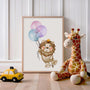 This cheerful wall art features a watercolor lion cub in a crown, floating while holding pastel balloons in soft pink, blue, and lavender tones. The light, airy illustration adds a joyful mood without overwhelming the space, making it ideal for a nursery, toddler room, or a calm play corner.