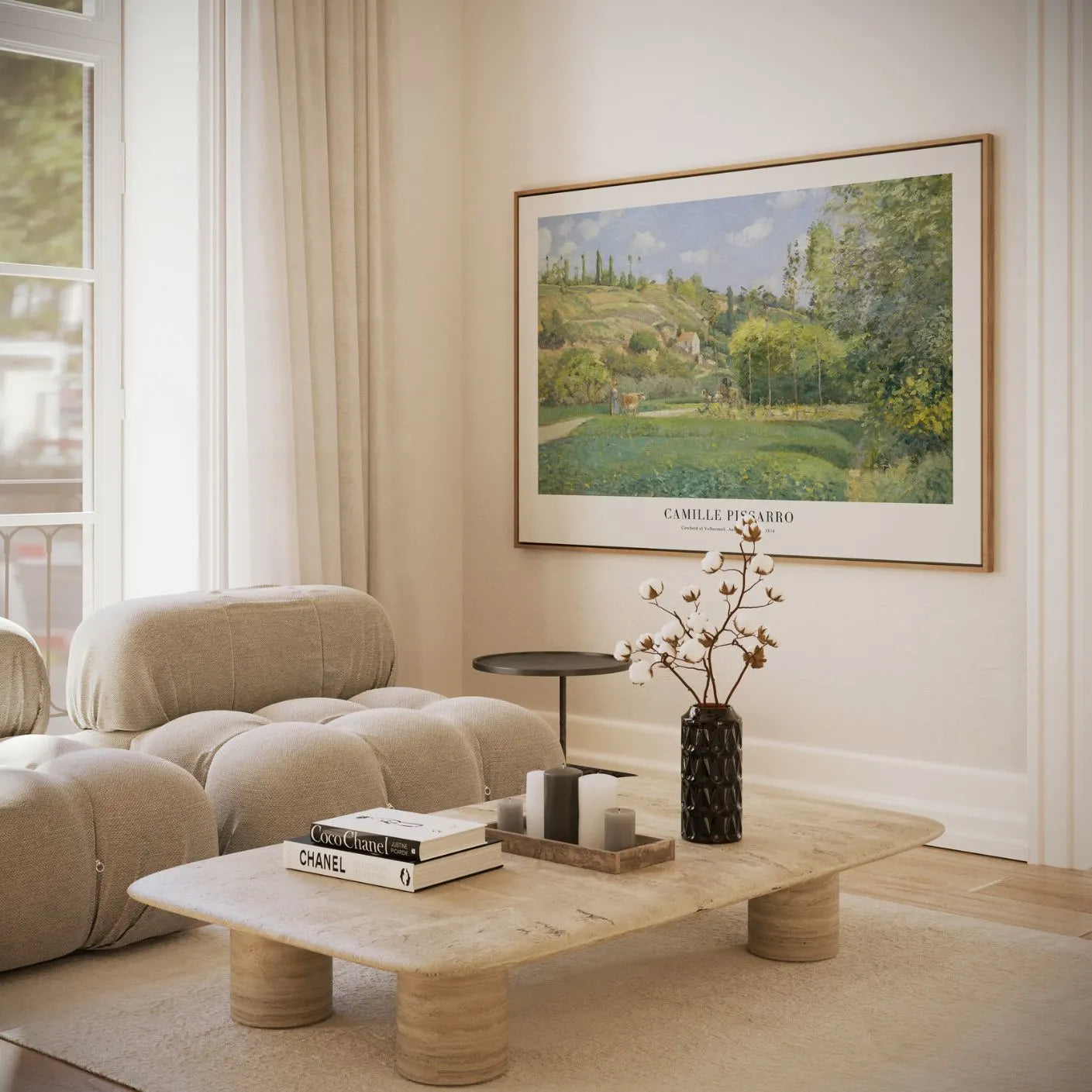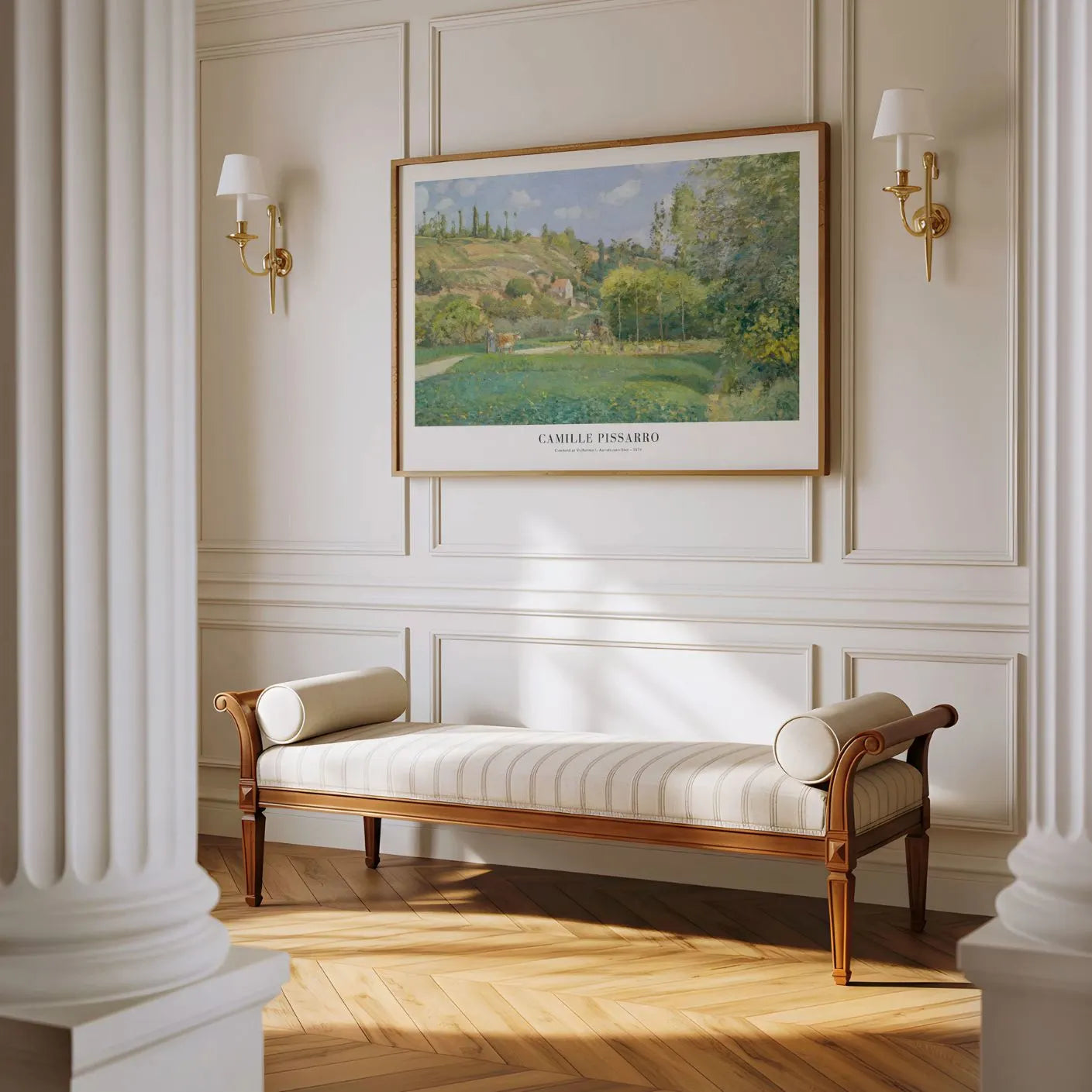 Pastel tones and layered greens create a warm, natural harmony, while Pissarro’s delicate brushwork keeps everything light and breathable. The result is an artwork that feels calm and welcoming, perfect for interiors that value nature, simplicity, and timeless French elegance.