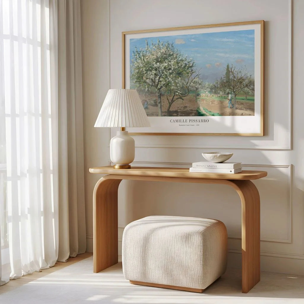 Pissarro’s subtle palette and relaxed composition reflect the peaceful rhythm of the English countryside. Light greens, soft florals, and open space give the scene an airy quality—perfect for interiors that feel bright, natural, and welcoming without excess decoration.