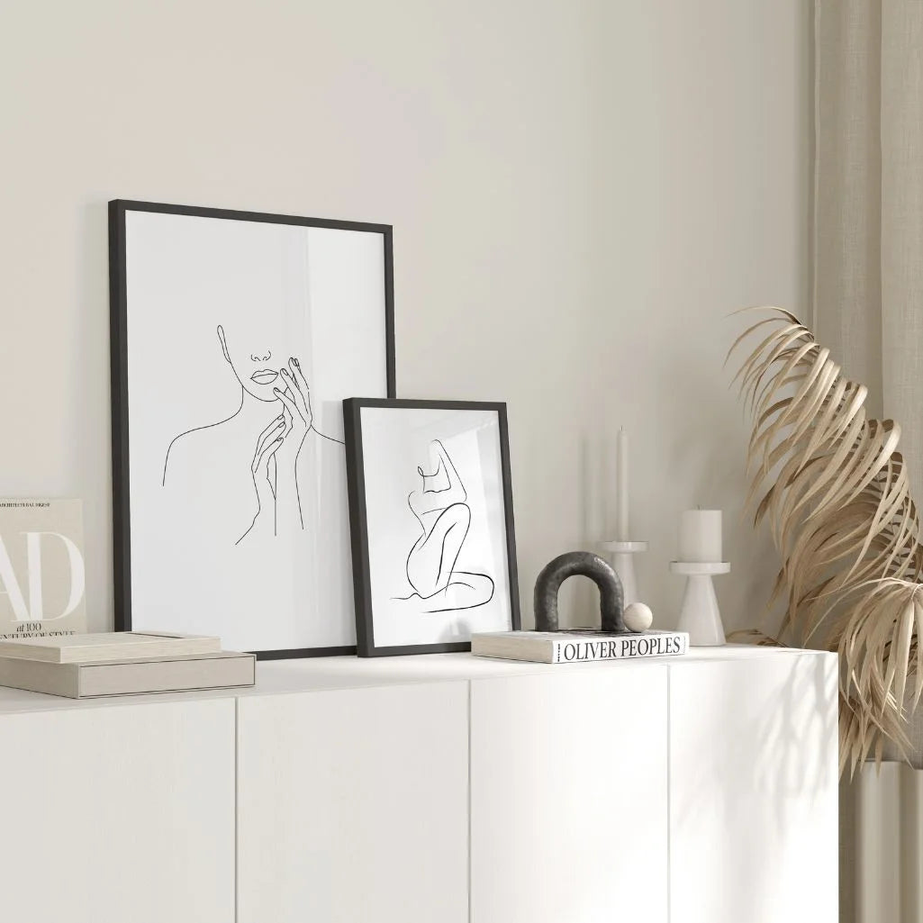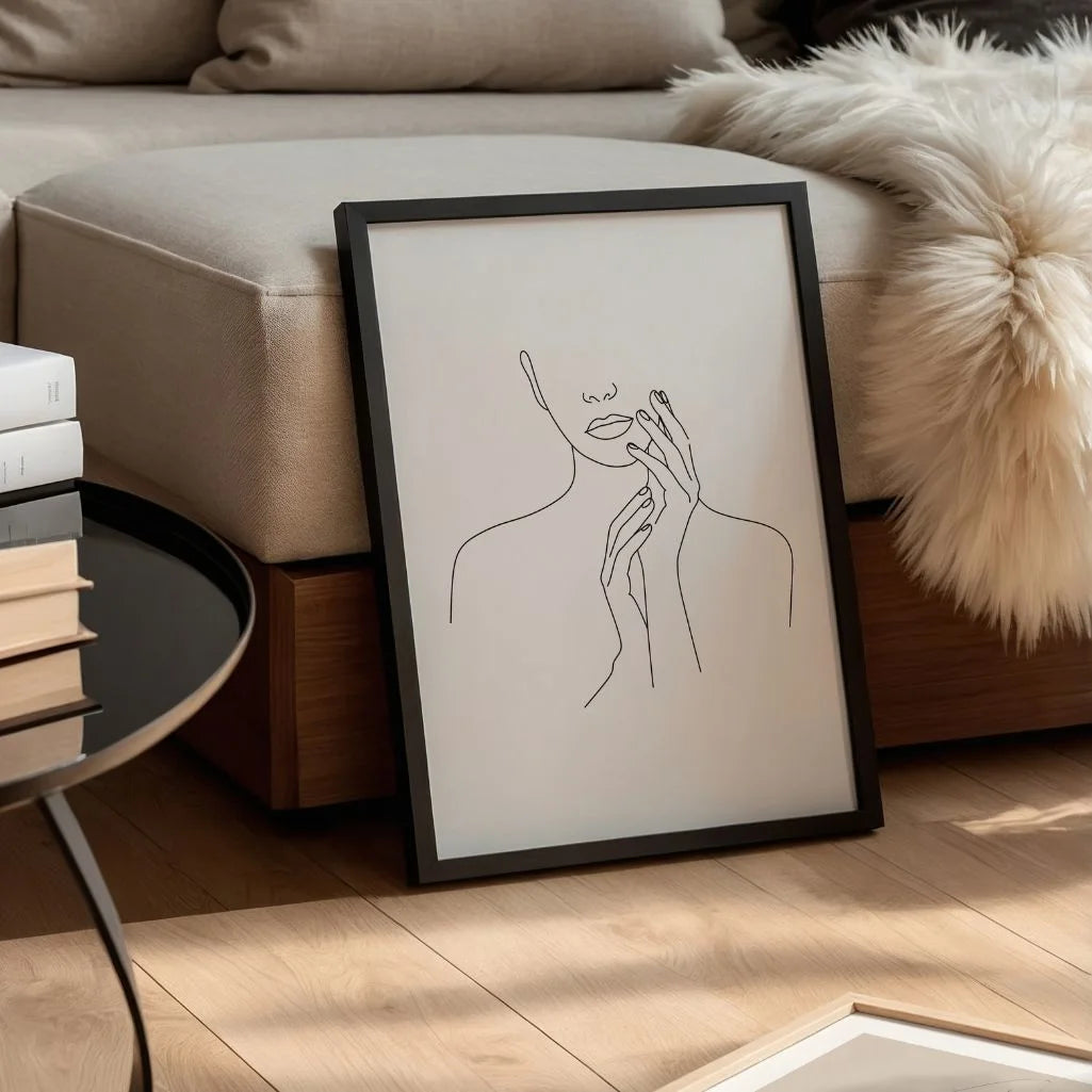 “Touch of Silence” is minimalist wall art featuring a female figure with delicate hands lifted in a calm, sensual gesture. Clean linework highlights femininity and balance, creating an artwork that feels refined, modern, and softly expressive—perfect for spaces where you want visual calm rather than bold statements.