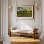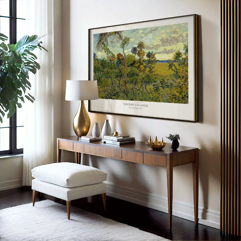 Bring radiant evening energy to your walls with this horizontal-format Vincent van Gogh Sunset at Montmajour poster. Painted near Arles, the scene captures fields and trees glowing before dusk, rendered with expressive brushwork and rich post-impressionist color.
